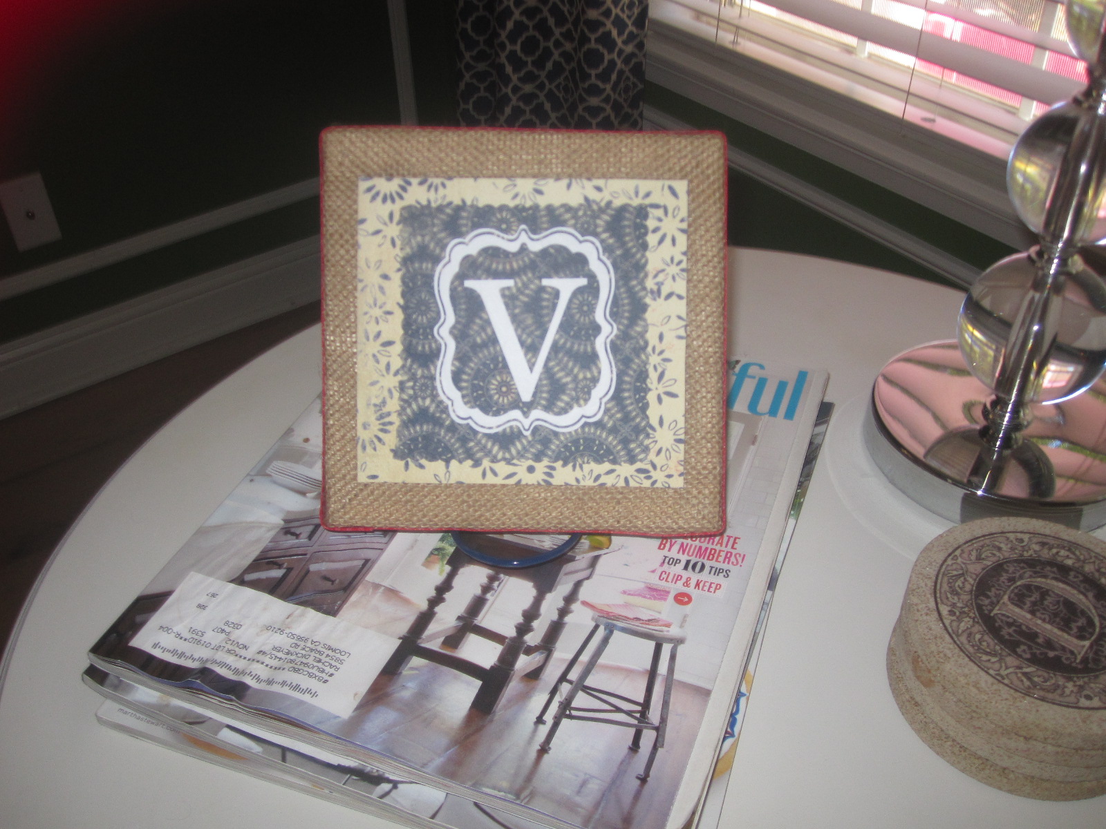 | Clearance burlap canvas with scrapbook paper, vinyl V and fabric tape around the edges. |